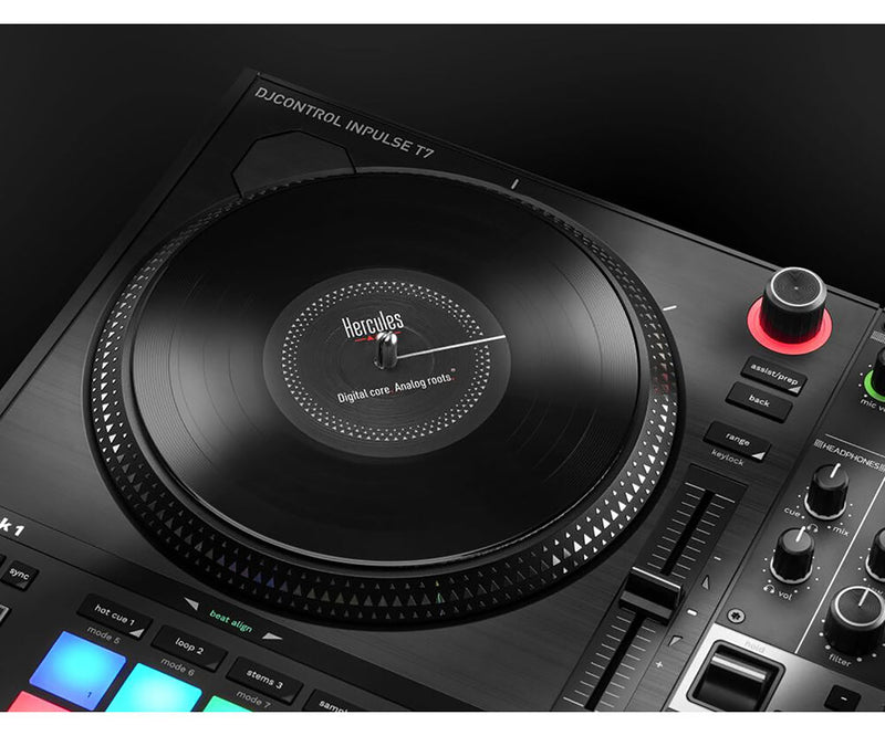 The DJControl Inpulse T7 from Hercules is a motorized DJ controller that combines the advanced modern technology of contemporary DJ controller units with the old-school stylings that vinyl DJ fans and scratchers crave. The T7 is compatible with Serato DJ software, providing complete control over digital music files organized in the Serato ecosystem with the bonus of emphasizing the tactile feel of vinyl records when performing mixes. It comes with two felt slip mats and two 7" replica vinyl records that are placed on the motorized platters to emulate the vinyl DJing experience and go from 0 to 33 1/3 RPM in just a tenth of a second.