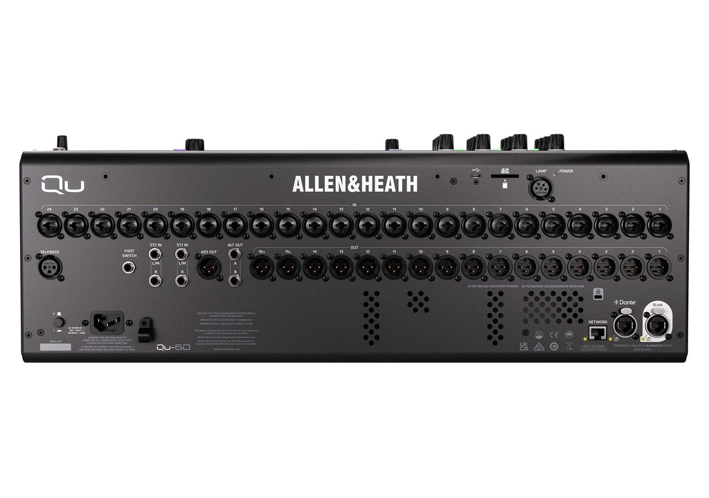 The Qu-6D model includes a built-in 16×16 Dante interface with a dedicated locking EtherCon port, enabling seamless integration with Dante-enabled systems operating at either 96kHz or 48kHz.