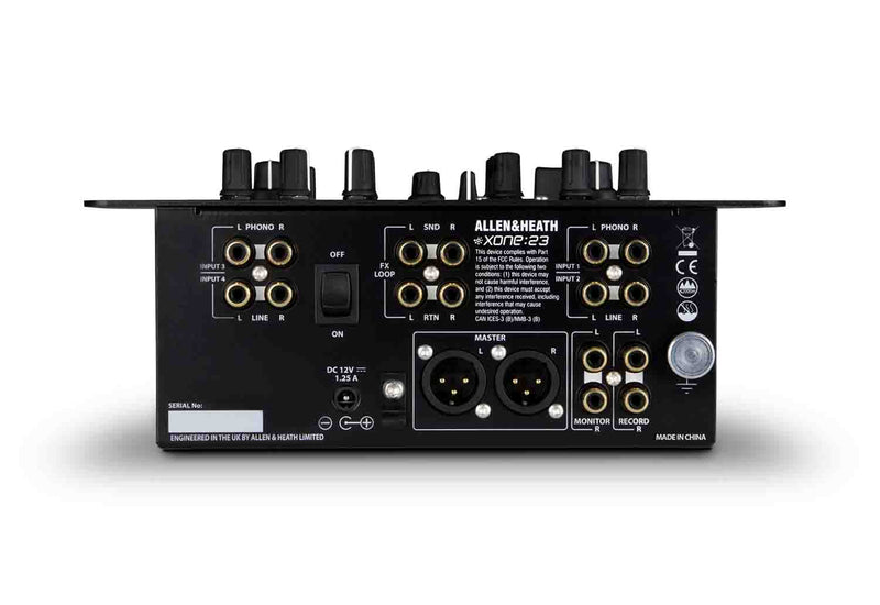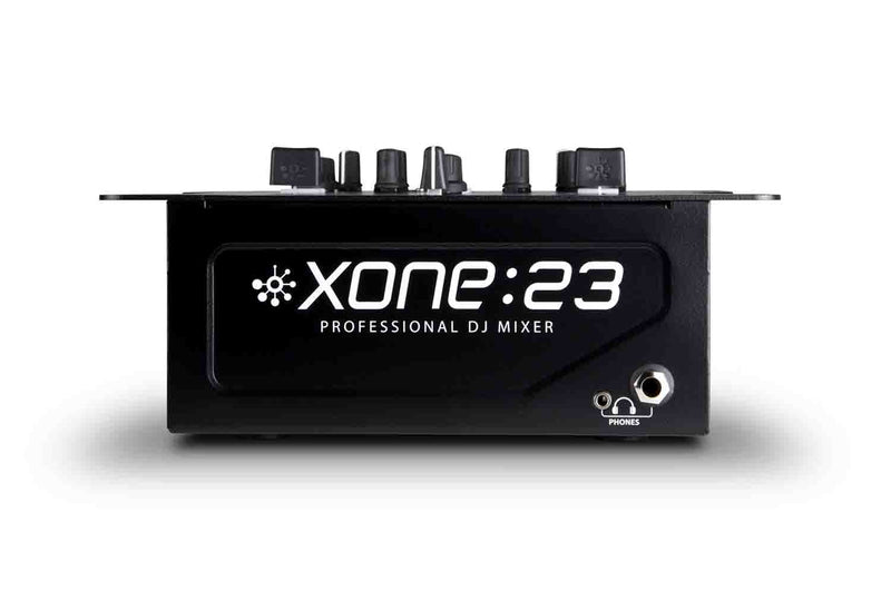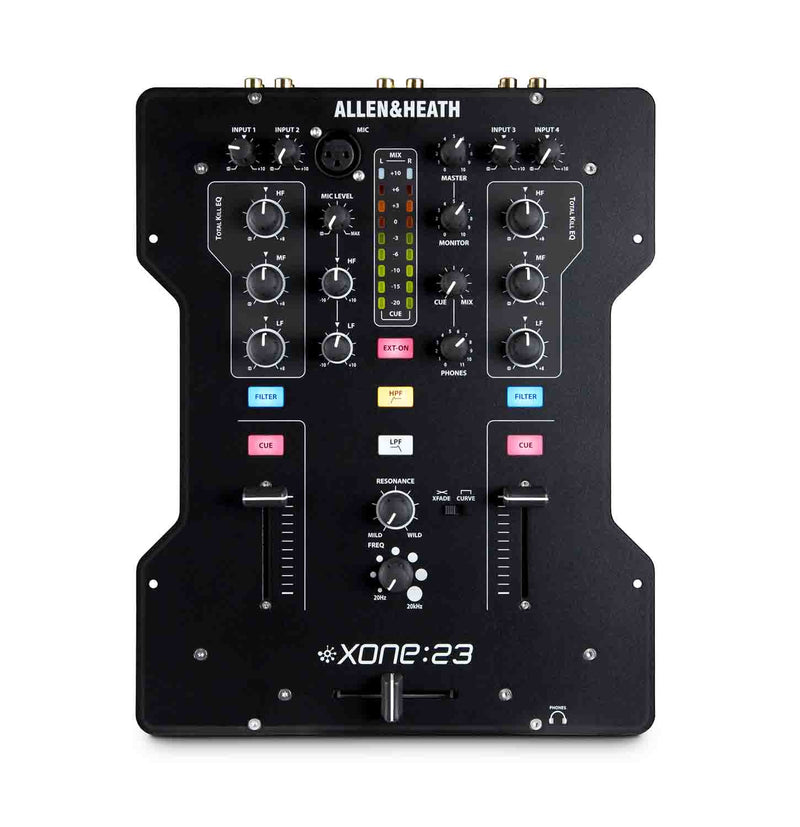 The Allen & Heath XONE:23 is a 2+2 Channel DJ Mixer. DJ mixer packed with pro features that would normally be found in the booth of a top-rated club, including an enhanced version of the legendary Xone filter with resonance control, VCA faders, 3 band total kill EQ, illuminated switches, crossfader curve selector and styling inspired by the flagship Xone:DB4. At the heart of the mixer is the renowned analogue Voltage Control Filter (VCF) system offering Low-Pass and High-Pass filters, frequency sweep and ‘mild to wild’ resonance control. There is also an FX loop to connect to third party FX units, which route back in through the filter system. The 2 stereo channels feature independent level controls for each input enabling up to four stereo sources to be simultaneously routed to the mix, as well as the dedicated send and return system for external FX.
