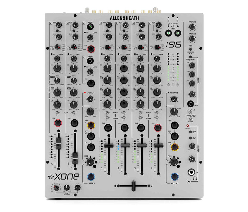 The Allen & Heath XONE:96 is an Analogue DJ Mixer with Audio Interface. The long-awaited follow-up to a genuine club classic. A new, uncompromising analogue DJ mixer, destined to be the heart of your creativity, Xone:96 takes the legendary soul of the acclaimed Xone:92 and redelivers it, enhanced, and with state-of-the-art digital connectivity. It’s all here. The huge, detailed, space-shaking analogue sound that only Xone delivers. A refined, precision 4-band EQ. Unrivalled dual Xone:VCF filters with CRUNCH harmonic distortion. And a dual 32-bit USB soundcard with Traktor Scratch certification right out of the box. Xone:96 lets you connect your whole rig, from laptops and turntables, to pedals, synths and drum machines. Two dedicated FX sends, four stereo input channels (with 4-Band EQ), two stereo input channels with all new 3-Band Parametric EQ + two auxiliary stereo return channels. And a separate master inserts for your outboard hardware. Explore new possibilities with a familiar layout of beautifully tactile controls. And rely on the industrial build quality that exceeds the demands of relentless back-to-back performances, night after night.