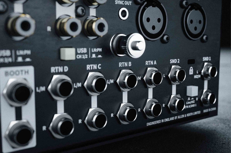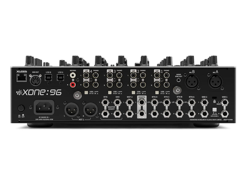Xone:96’s rear panel is fully-loaded with I/O. Alongside all the analogue connections you’d expect to find, DJs will welcome the addition of 2 stereo sends, 4 stereo returns and a dedicated master insert. Send 1 is switchable from Line to Hi-Z level, making it ideal for incorporating instrument level effects, like classic guitar pedals. X-Link allows you to hook up Xone:K series controllers to the Xone:96 for hands-on control over your software, saving USB ports on your laptop. MIDI I/O is catered for via the 5-pin connection on the rear panel, and via both USBs.