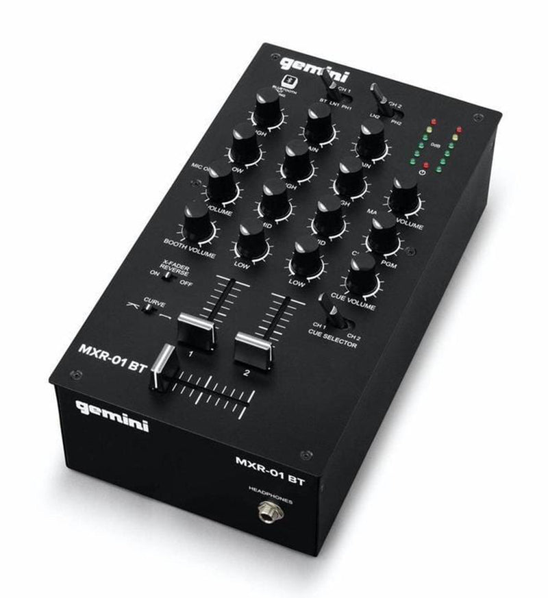 The Gemini Sound MXR-01BT, 2-Channel Professional Dj Mixer with Bluetooth Input features a 1⁄4” microphone input with dedicated volume control and EQ plus multiple phono/line stereo channels, allowing up to 5 audio sources connected at once. Balanced and unbalanced Master outputs allow for easy connection to your sound system plus an independently controlled Booth output. Crossfader features VCA curve control and reverse switch and is easily replaceable. Built-in Bluetooth connectivity allows for wirelessly streaming music from your smartphone/tablet directly to your mixer.