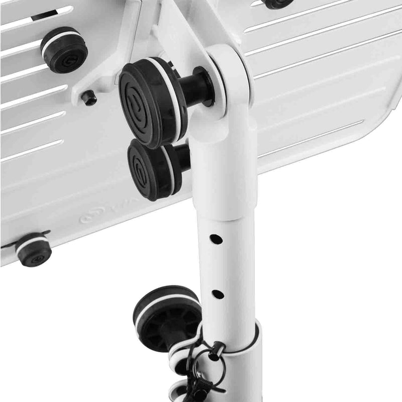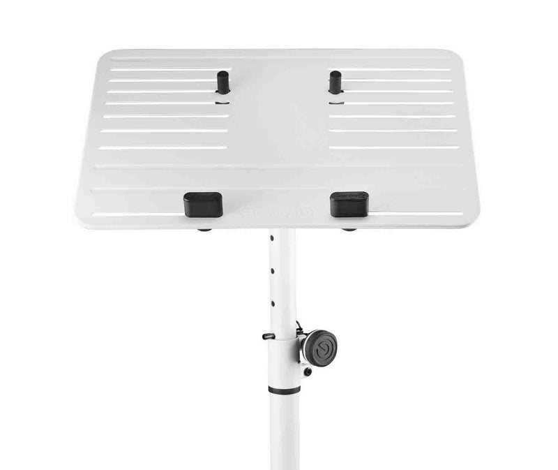 The Gravity LTS T 02 W, Universal Laptop Stand with Adjustable Holding Pins and Steel Base - White offers you this possibility. Whether you're a musician, technician, photographer or stay-at-home worker, the universally applicable, flexible and very stable tray means you no longer need to worry about your work equipment. There are many ways the large, height-adjustable tray panel, which offers enough space to accommodate all common 12 "to 17" laptops, can be used. The four adjustable retaining bolts - which can be removed if required - ensure the safe and secure positioning of laptops, tablets or compact mixers on the tray. Numerous ventilation slots enable the proper ventilation of electronics. Extra flexibility is offered by the tray panel which can be adjusted to any angle. This allows the LTST 02 W to be used both vertically and horizontally, for example, to keep your notes visible at all times when giving a talk.