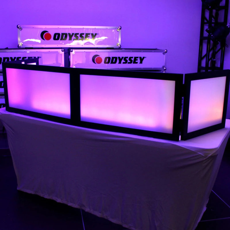 The Odyssey SWFTT5816B, 58 X 16 Inches White Pro DJ Facade with Black Frame is perfect for your standard 6-foot-long banquet table consisting of four detachable steel flag-hinged sections with a super lightweight, black powder coated aluminum frame. Have a longer than usual setup? You can combine the center sections from multiple SWFTT5816B sets to create a wider table facade if needed. The white dual layer scrim faces are fire retardant treated and can be used in conjunction with lighting effects to create that perfect look for any momentous occasion. After the gig, if you find a stain on the scrim from an accidental drink spill or other mishap, no problem. All that is required is a screw driver to simply remove the scrim for cleaning.