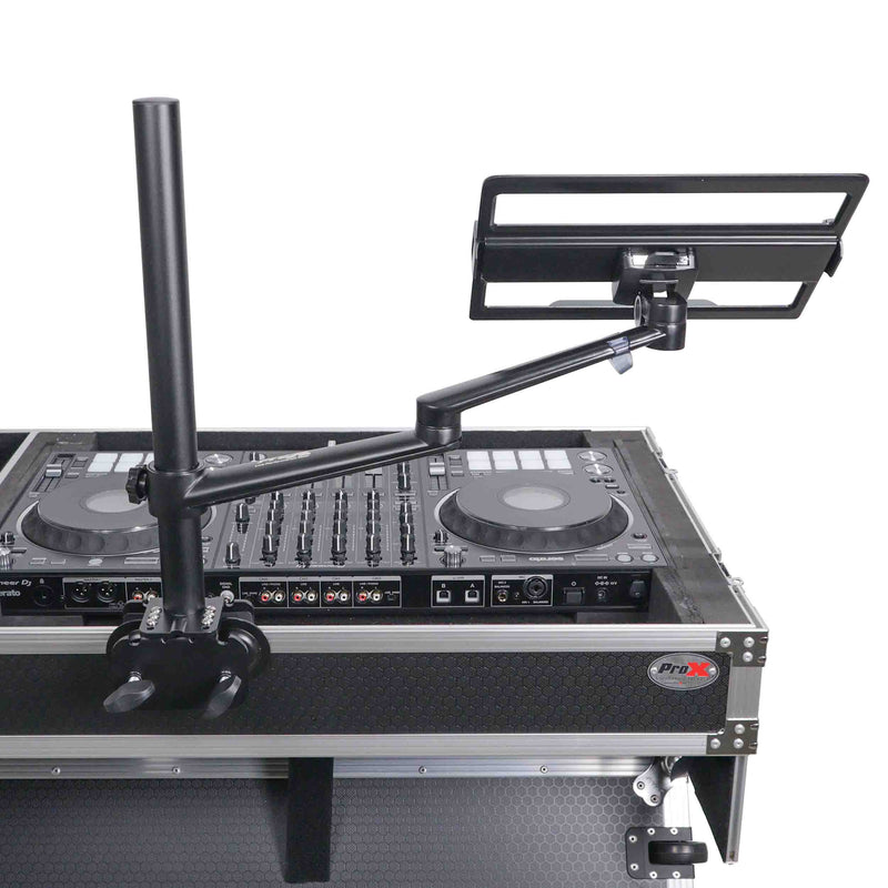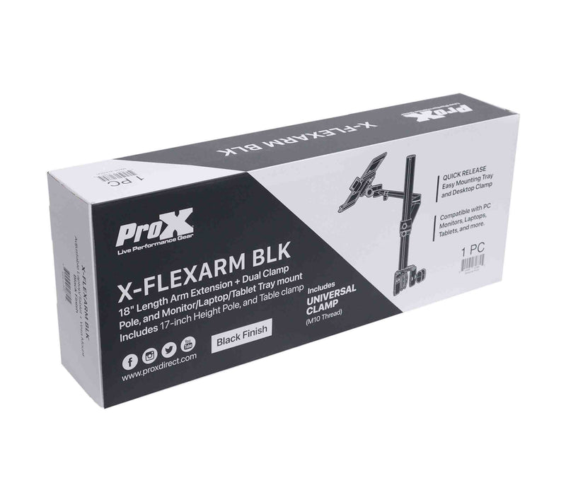 The ProX X-FLEXARMBLK is an Adjustable Arm Mount Mount Stand for 12-17" Laptop,VESA 75X75 and 100X100 fit 17-32" Monitor, Flight Case/Table in Black. Introducing the Flex Arm, your ultimate solution for seamless device positioning and accessibility! Designed with unparalleled versatility, this Universal Adjustable Stand redefines convenience for laptops and tablets alike. Crafted to adapt effortlessly to various settings, it boasts a cutting-edge clamping system that securely fastens to both tables and DJ cases, ensuring stability and reliability in any environment. Experience unparalleled freedom and ergonomic comfort as you effortlessly adjust the height, angle, and orientation of your device.