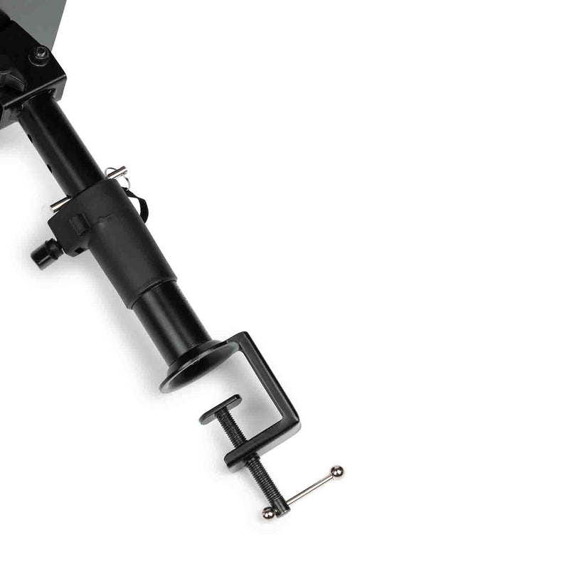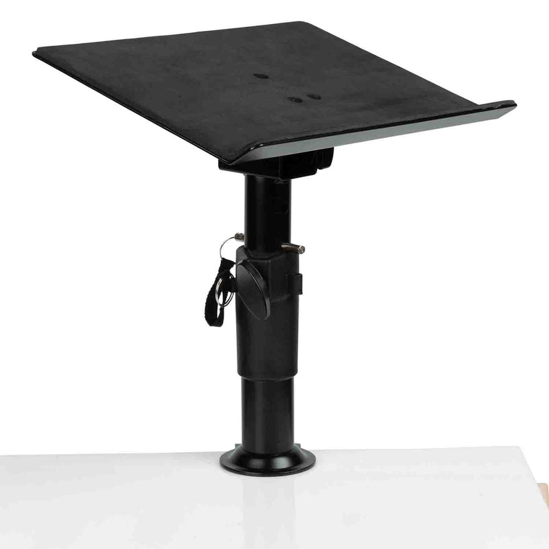The Gator GFWLAPTOP2500 Clampable Laptop and Accessory Stand Used for Multi-purpose Top Deck Surface Holds Most Laptop Computers (Including MacBook Air, MacBook Pro and Microsoft Surface Models). 12”/305mm x 9”/229mm Top Platform with Soft, EVA-Lined Surface. Height Adjustable from 10”/254mm to 14”/356mm. Ergonomic Platform with 15-Degree Angle Adjustment for Easy Access to Keyboard and Controls. Clamps to Desktop Surfaces 2.63”/67mm in Thickness. Steel Construction with Black Powder Coated Finish.