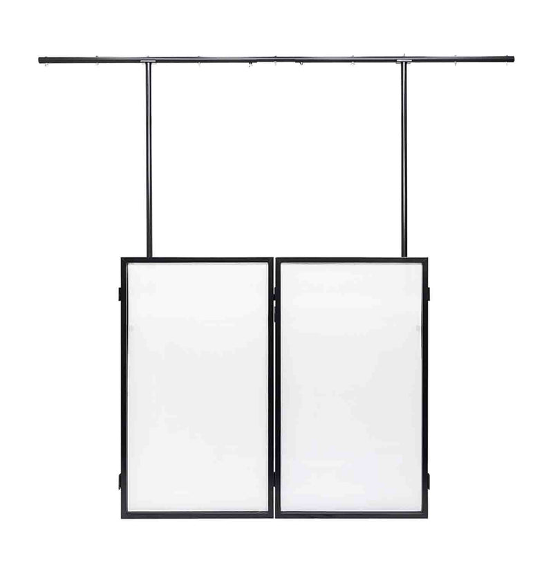 The lighting bar attaches directly to the facade’s side panels and can be set up as a goal post or as two independent T-bars. It is height-adjustable from 88” up to 93”. It features seven fixture mounting points distributed over its 98” width, and includes all mounting hardware for use with your favorite lighting fixtures. The system assembles in a few minutes and requires no tools. The facade can be folded and stowed in it carrying bag with scrims attached. A separate bag is provided for all hardware and poles to keep your facade and scrims free from dents and scratches. The entire system easily fits in most SUV’s and cargo vans, and weighs only 64lbs.