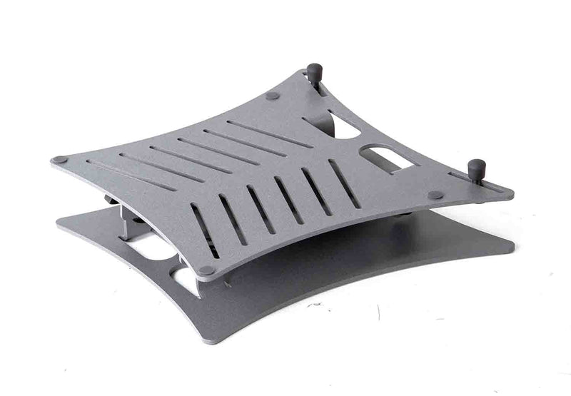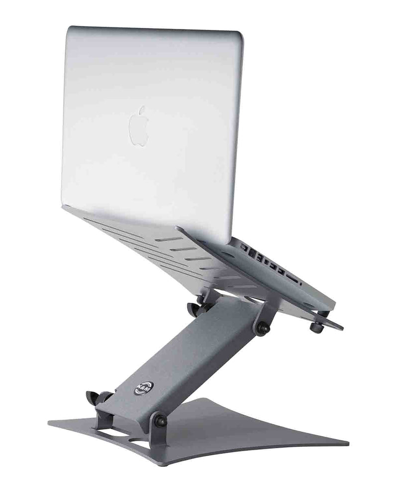 The K&M 12195 is a Foldable Laptop Stand Gray. Visually and haptically appealing, the laptop stands 12195 is finished in a high-quality grey powder coating. The attractive steel base plate and the robust hinge joints provide excellent stability. The support plate and the extension arm are made of aluminum and ensure a low weight. Due to its functionality and versatility, the laptop stand can be assembled and disassembled in no time. The package is very flat and with the optional 12199 carrying case it is perfectly suited for the mobile DJ and musician. Individually adjustable stop pins with rubber caps allow the use of all common laptop models, mixers, CD players, etc. The maximum application height is 265 mm and can be individually reduced to 65 mm. Protective support pads and anti-slip rubber feet are included in the delivery.
