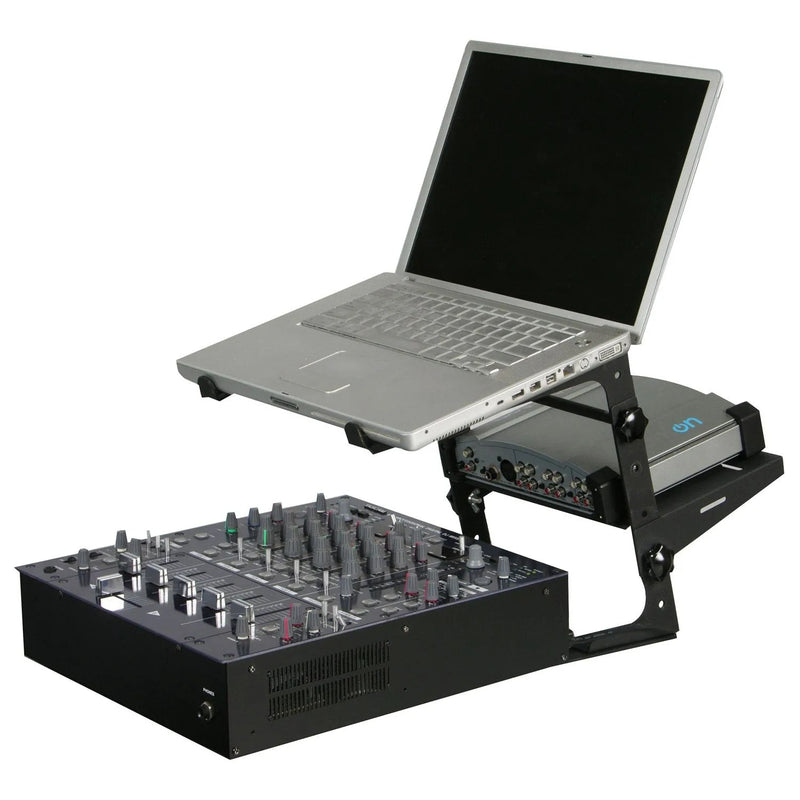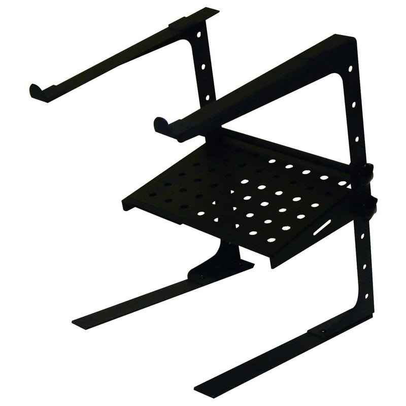 Odysseys folding L STAND MOBILE is a light and portable stand to place your laptop, CD, Digital Media Player, compact DJ Controller, Effects, Drum machines, or lighting controller. Odysseys L STAND MOBILE comes complete with stand alone legs for a table top configuration and clamps so it can be fixed to the edge of a table or the wall of your case just the way you like.