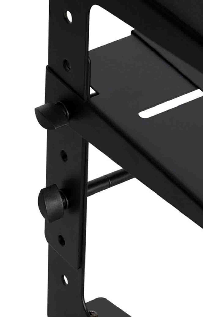 The Onstage LPT6000 Multipurpose Laptop Stand adjustable in height, the unit elevates a laptop or other device to a comfortable viewing and operating level. The versatile base can either rest on flat surfaces or clamp to tabletops or other equipment. The upper platform securely holds a device while the lower shelf provides a convenient place for accessories. The overall width adjusts to accommodate larger pieces of gear. Padding on the contact points increases grip and protects equipment from scratches.