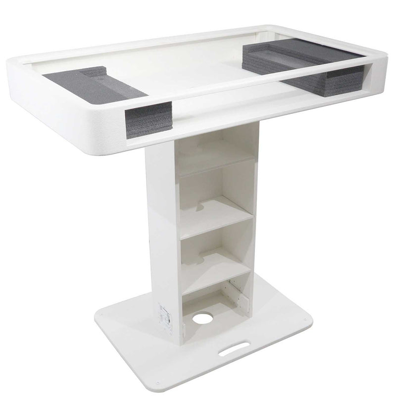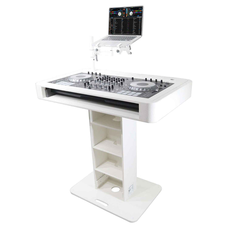The T-shaped DJ Controller podium is manufactured in Poland made from the highest quality materials in Europe. Top-quality birch plywood finished with white warnex textured paint. The inside of the control deck is lined with high-density foam that stabilizes and secures your controller firmly into the control deck. Place your laptop on the secure tray attached to the included boom arm that can tilt, swivel, rotate, raise, and lower to your desired position. The podium center is equipped with three-tier shelves (for utility storage, mics, cables, etc). There are pre-drilled holes in each shelf to allow power and audio cables to pass through from the controller down to the base area.