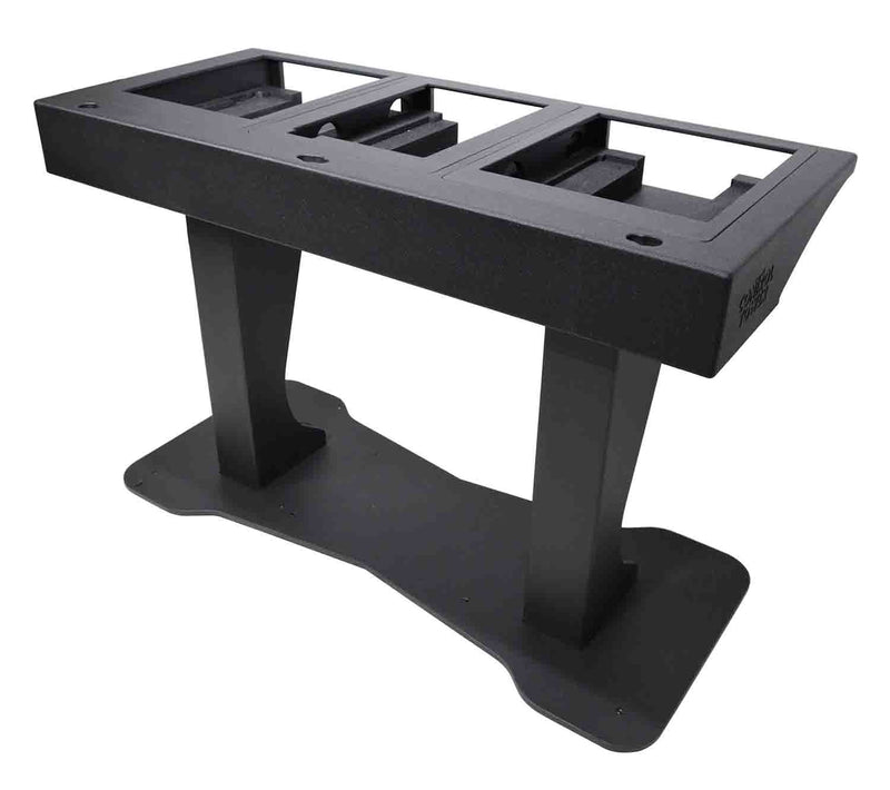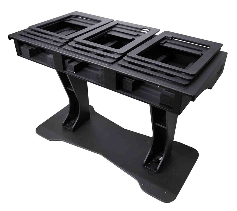The T-shaped DJ Controller podium is manufactured in Poland made from the highest quality materials in Europe. Top-quality birch plywood finished with black warnex textured paint. The inside of the control deck is lined with high-density foam that stabilizes and secures your controller firmly into the control deck. Place your laptop on the secure tray attached to the included boom arm that can tilt, swivel, rotate, raise, and lower to your desired position. The podium center is equipped with three-tier shelves (for utility storage, mics, cables, etc). There are pre-drilled holes in each shelf to allow power and audio cables to pass through from the controller down to the base area.