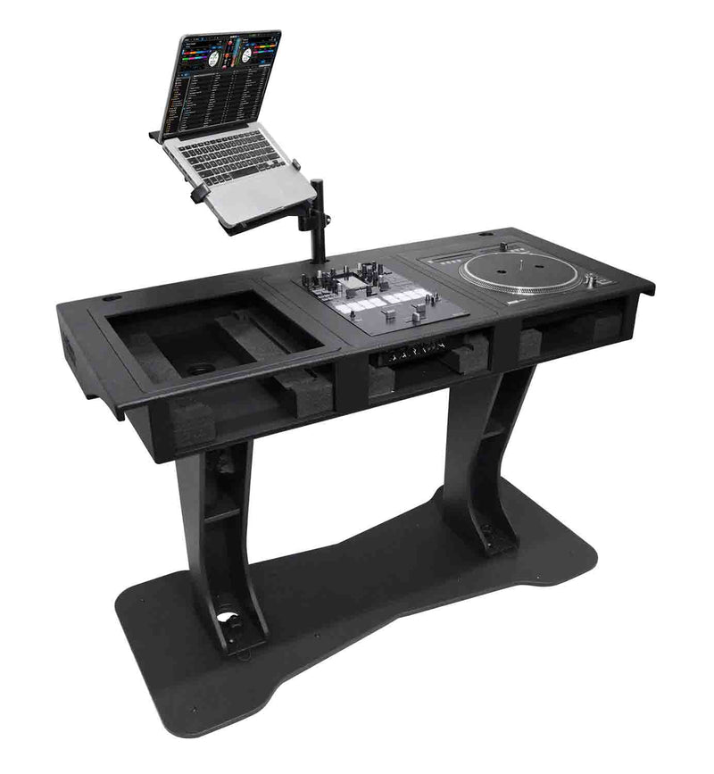 Out of the box, assembly takes minutes with no tools required. Simply snap-lock the base plate to the center shaft together with the steel butterfly latch locks. Once the center column and shelves are installed, mount the top control deck to the top of the column, and then secure it with the latches. Included in the box are 4 custom cut foam inserts and top frames to use with your desired DJ controller. Once the controller has been placed inside, apply the frame and now you can mount your boom arm and laptop tray to the left or right position.