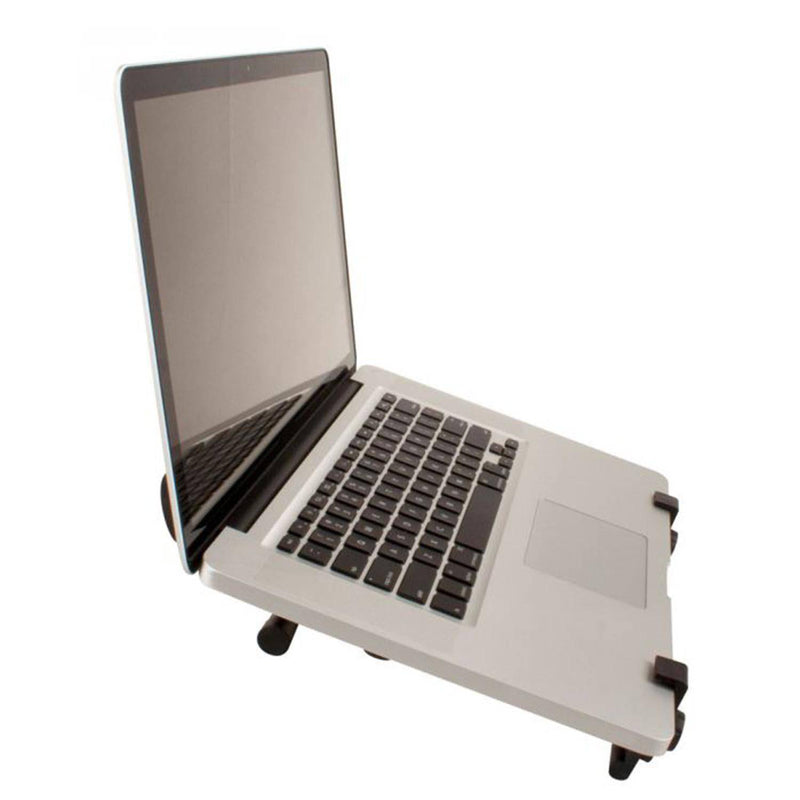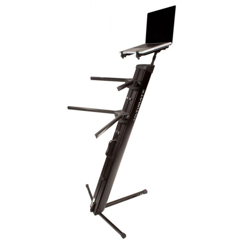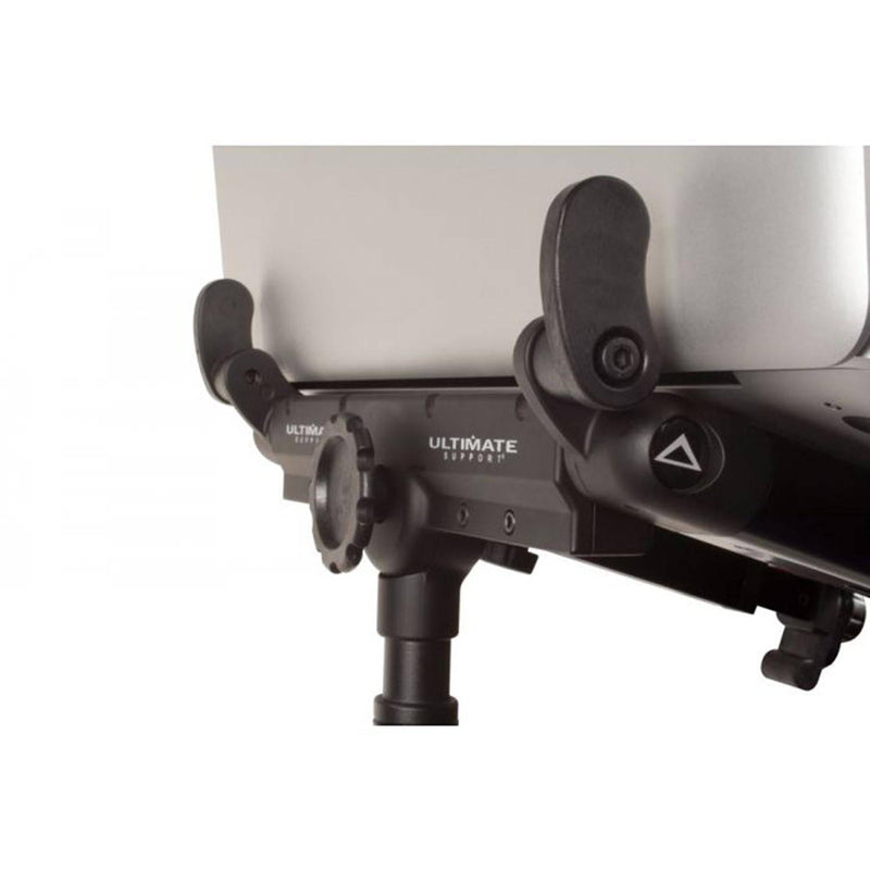 The all-new HyperMount QR is a dynamic laptop stand that mounts to any 5/8” threaded stand – such as a microphone stand or an Ultimate Support APEX AX-48 Pro keyboard stand – but also sits on a desktop with the included T-stand adapter. The HyperMount QR features angle-adjustable telescoping support arms that support laptops, small mixers, groove production electronics, drum pad controllers, and more.