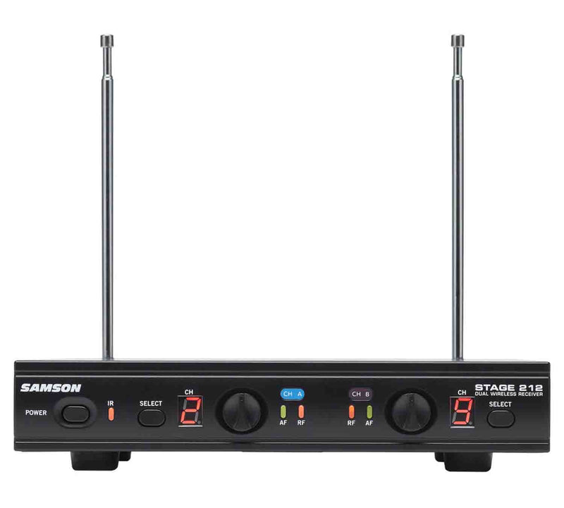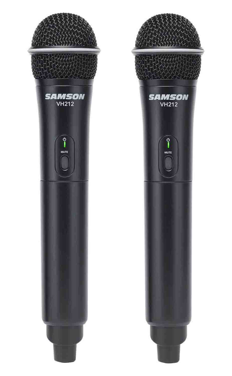 The Samson SWS212HH-E is a Stage 212 Frequency Agile Dual-Channel Handheld VHF Wireless System 173 to 198 MHz that provides two handheld dynamic microphones, that transmit to a single rugged metal receiver. It can be used to capture audio in a variety of environments such as home karaoke, live presentation, education, houses of worship, and other dual-performer applications.