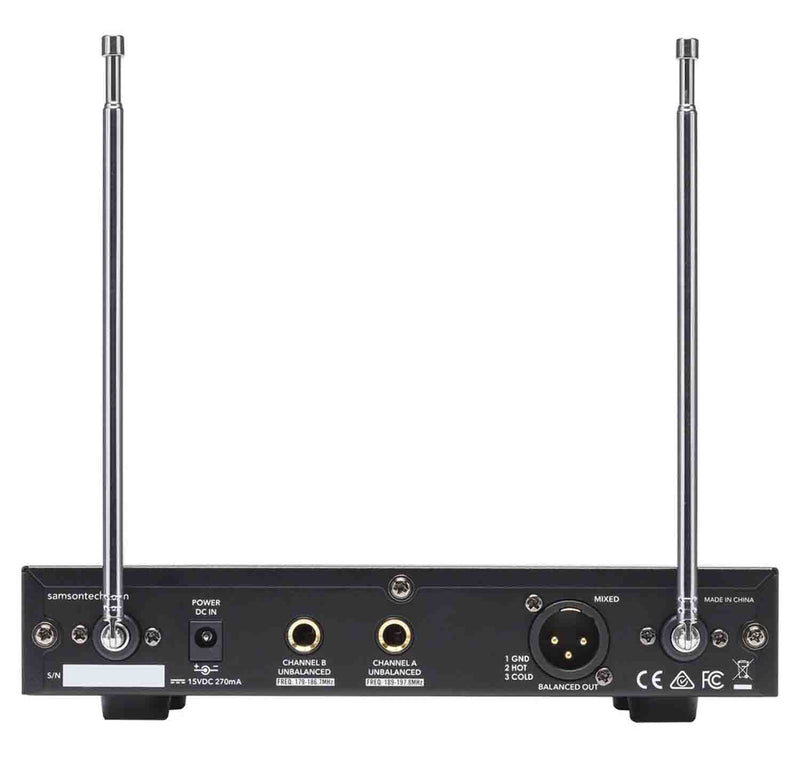 The Stage 212 design offers 12 operating channels across a 173 to 198 MHz frequency range. The system's IR sync function allows users to wirelessly match each transmitter to a receiver's operating frequency and do so quickly. A 200' operating range provides freedom for any presenter or performing duo. In addition, the VH212 transmitters each offer up to 12 hours of battery life using two AA batteries (sold separately).