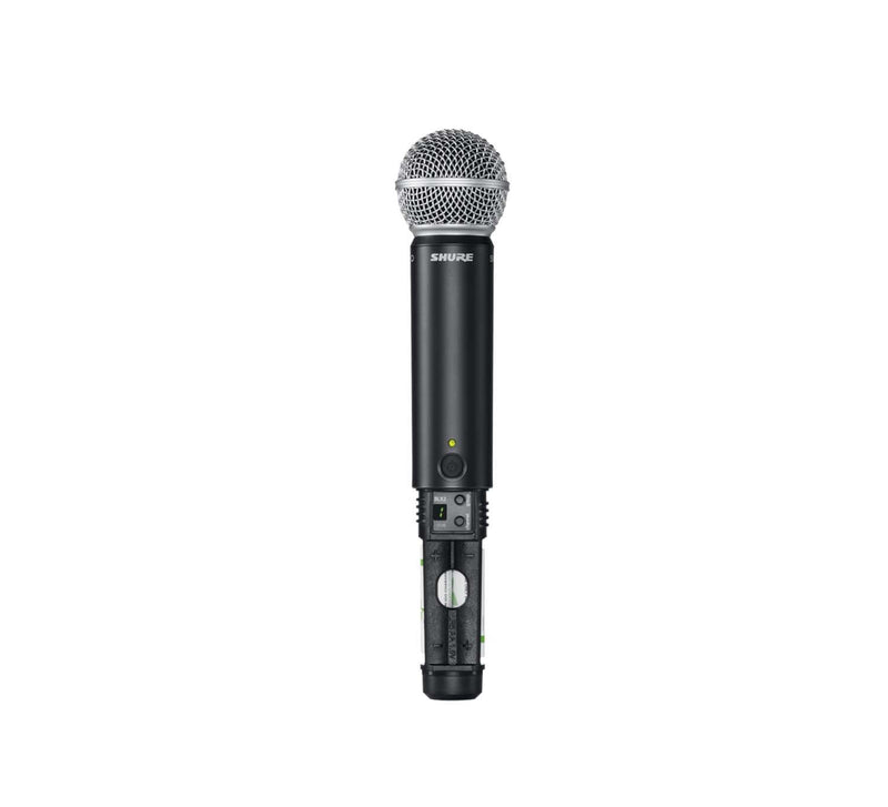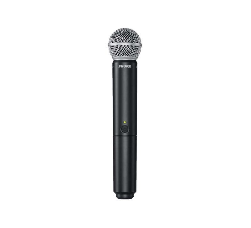 Includes BLX4 single-channel receiver, BLX2/SM58 handheld transmitter, microphone clip, power supply, 2 AA batteries, and user guide.
