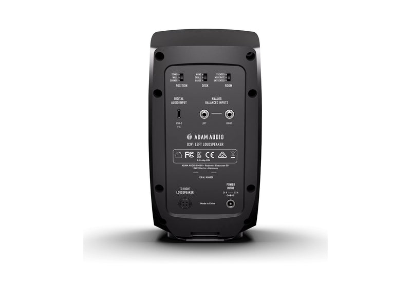 The Adam Audio D3V, 3.5-Inch Powered Studio Monitor - Black is a fully active desktop monitoring system that stays true to ADAM Audio’s industrial design heritage and features the iconic AMT tweeters. Each pair features 3.5” aluminum woofers and a ferrite magnet system, driven by an astonishing 240 W total system amplification. Dual-sided 3.5” passive radiators bolster bass frequencies and allow the D3V to extend down to 45 Hz.