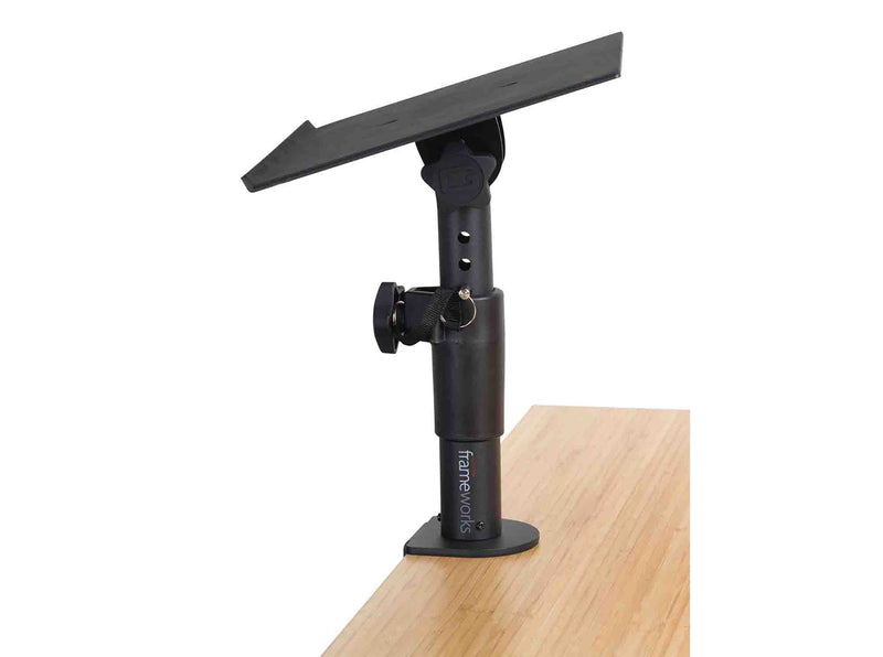 The Gator Frameworks GFWSPKSTMNDSKCMP is pair of (2) Desktop Studio Monitor Clamp-On Stands. 12”/305mm x 9”/229mm Speaker Platform with Soft, EVA-Lined Surface. Fits Most Small-Sized Studio. Monitor Speakers both Vertically and Horizontally. Multipurpose Top Deck Surface Holds MacBook Air and Pro Models. Clamps to Desktop Surfaces 2.25”/57mm in Thickness. Height Adjustable from. 10.13”/257mm to 13.5”/353mm. Speaker Platform Tilt Angle Adjustable from 0-15 Degrees. Black Powder Coated Steel Construction Max Recommended Weight Capacity of 60 lbs./27.23 kg.