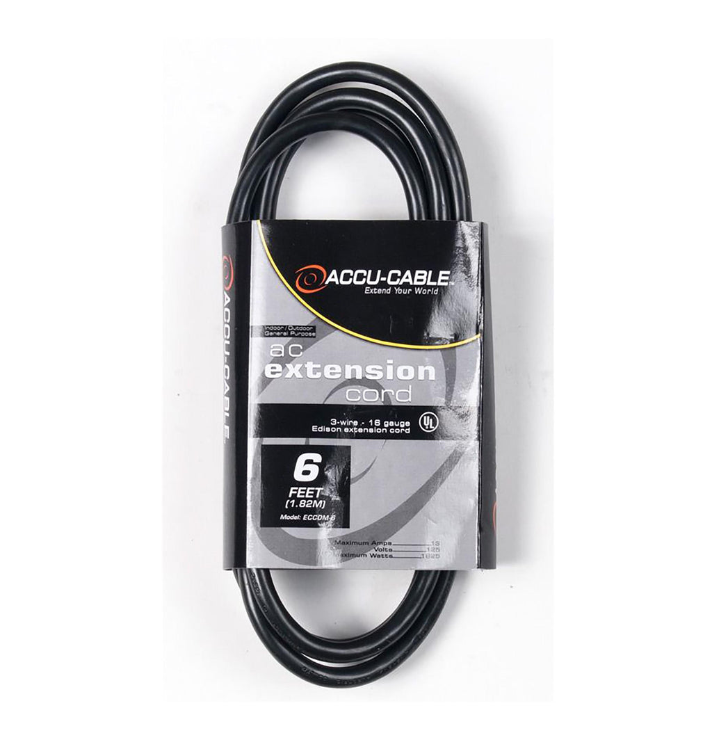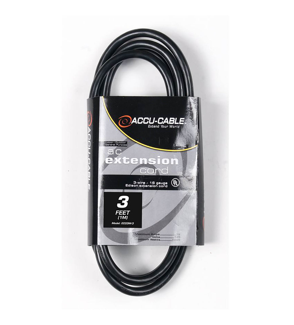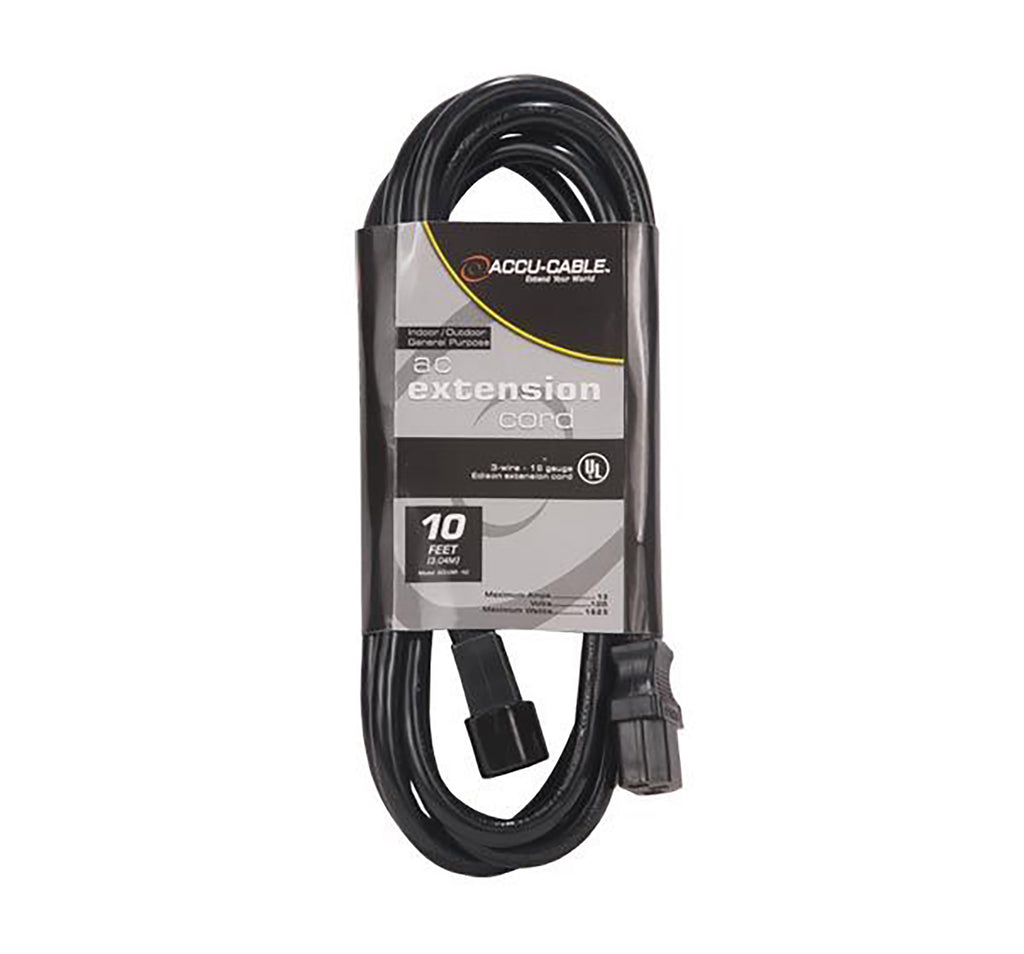 The Accu-Cable 16 Gauge IEC Male to IEC Female AC Extension Cord - Black is an Indoor/Outdoor General Purpose IEC Extension Cord and is appropriate for both home and professional applications. The 3-wire 16-gauge cord features a ground prong and can extend the connection-cable length of a wide variety of electronics. The cord is rated to 13 amps, 125 volts, and a maximum of 1625 watts.