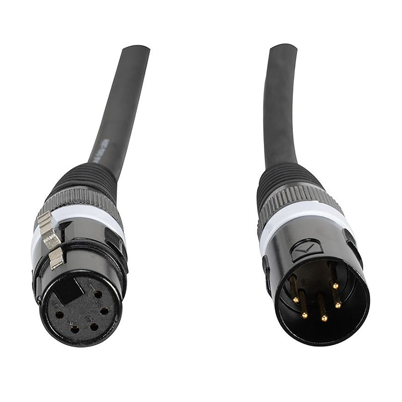 The 50-foot DMX Cable - 5-pin male to 5-pin female connection, No memory rugged cable: 22 AWG stranded (0.15 x 19) tinned copper conductors, polyethylene insulation, twisted pair, polyethylene inner jacket, Duofoil (100% coverage) and cotton plus a tinned copper braid shield (85% coverage), PVC jacket to prevent from kinking.