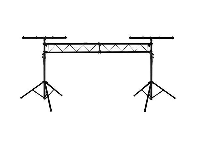 This set includes 2 black steel tripods that each extend up to 9 ft. in height and 2 5 ft. truss I-beams that fit together to create a 10 ft. trussing span. This set also includes 2 additional T-Bars on top of the tripods to hang even more lighting units. The LTS50T AS supports any combination of lighting fixtures up to a combined total of 200 lbs., but yet weighs only 45 lbs for easy transport.