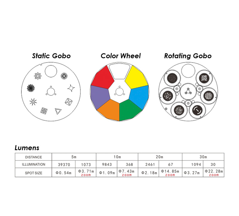 2 Gobo Wheels: 8 Fixed gobos + open / 7 Interchangeable