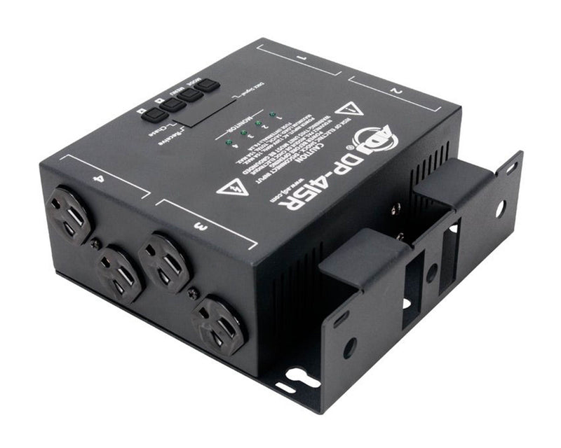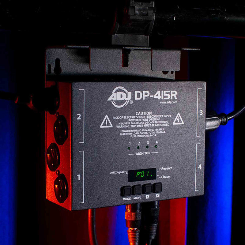 The ADJ DP-415R, 4-Channel dimmer and switch pack has eight 3-prong 15 Amp Edison socket (2 for each channel) that allows you to control up to 8 fixtures. The pack has a 4-button digital display menu and is RDM (Remote Device Management) compliant.