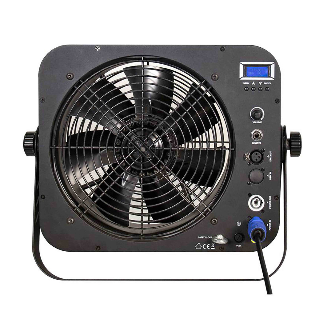 The robustly-constructed machine features protective metal grilles to the front and rear of the fan as well as a dual-purpose bracket that can be used to either stand the unit on the floor or attach it to truss or another similar support structure. It features both locking power input and output sockets, which means that the power supply for multiple units can be linked together. With dimensions of 13.75” x 16.5” x 5.25” / 350 x 422 x 131mm (LxWxH) and a weight of 19 lbs. / 8.56 kg, the machine is easily portable but capable of producing powerful wind effects suitable for use in theatres, on concert tours and for large-scale one-off events.
