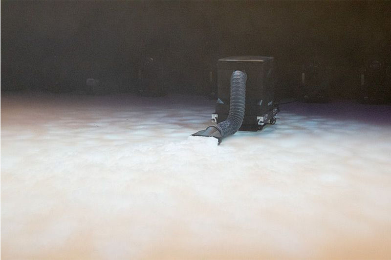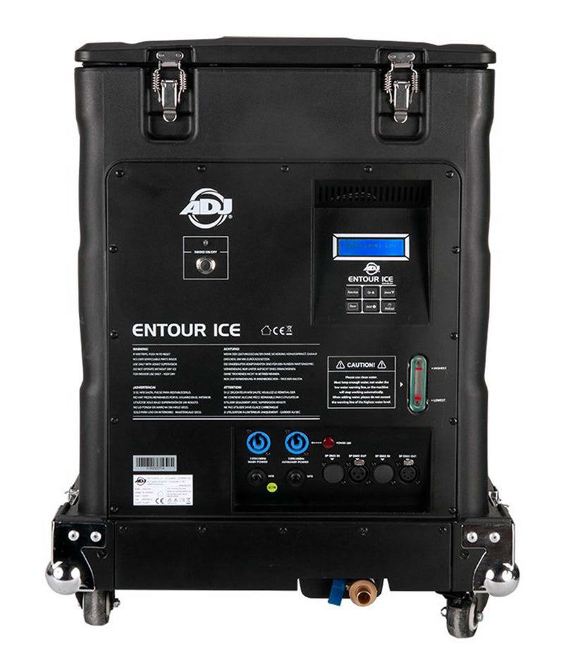 The ENTOUR ICE is a professional, tour-grade dry ice fog machine, well suited for stages, theaters, houses of worship, nightclubs, concert venues, and event productions. The Entour Ice is built into a professional-grade road case with casters and features a motorized 26.5 lb dry ice basket that drops into an 8.5-gallon heated water tank. Control options include a built-in timer, manual and DMX control, and has three channel modes. The unit utilizes a dual element heating system that requires two power circuits for full operational output. A 4.9' fog conduction hose is included and features two clamps and a wide-mouth fog dispersion adapter. The Entour Ice also includes four casters, a flight case cover, and two power cords.
