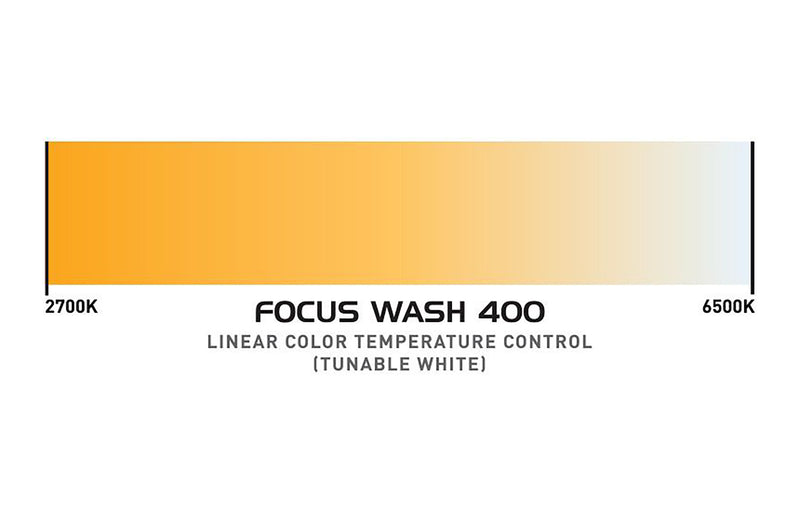 The ADJ Focus Wash 400, LED Moving Head Wash with Motorized Zoom with RGBACL LED engine. A 6-inch Fresnel lens with 10-to-41-degree motorized zoom produces an even field light output. Ideal for live broadcasting and film use, this fixture has flicker free operation, adjustable refresh rates from 900Hz to 25kHz, a quiet fan mode, linear white color temperature control from 2700K - 6500K, as well as, preset white color macros (2700K, 3200K, 4000K, 5600K and 6500K). In addition to its tunable white feature, the Focus Wash 400 has a virtual CMY color mixing channel which allows users to choose any hue on a color picker.