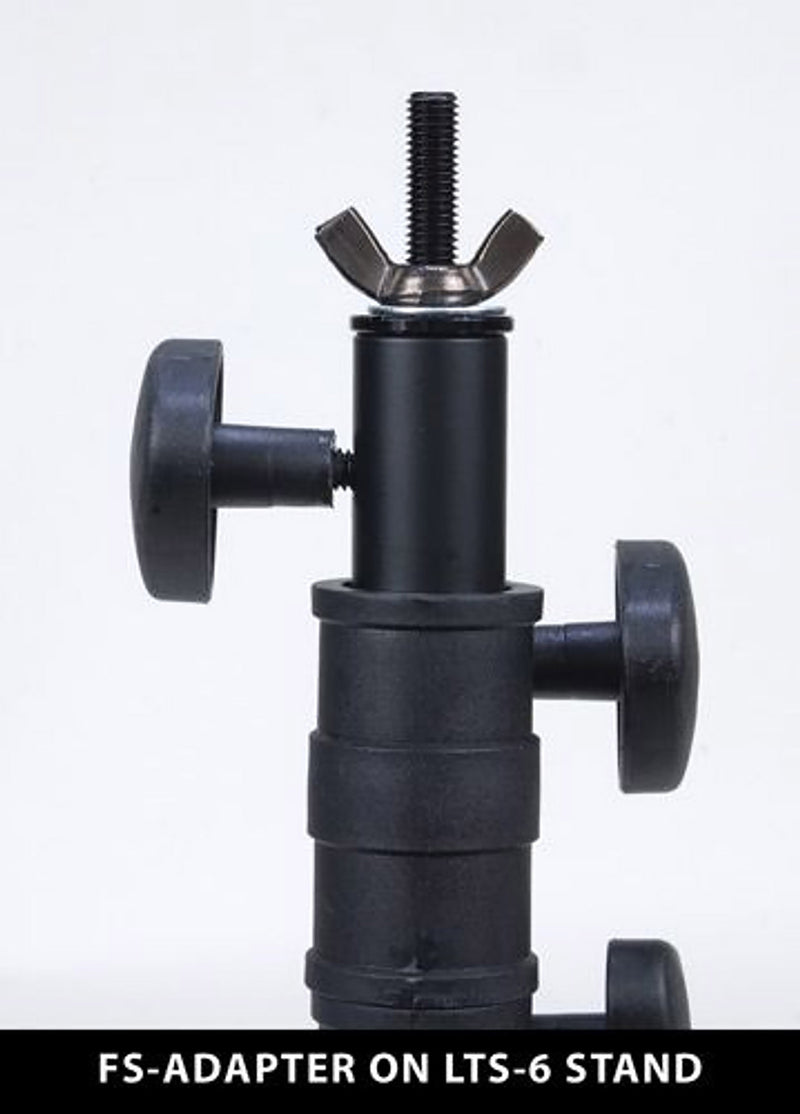 The ADJ FS-Adapter, Top Adapter for LTS-6 Stand is a part for the stand which is designed to hold four PAR can lights from its T-Bar. The Top Adapter has a stud with a 1.65" thread. The stud fits into the top of the stand, while the thread is pushed through the center of the T-Bar. The bar is secured by an included wing nut.