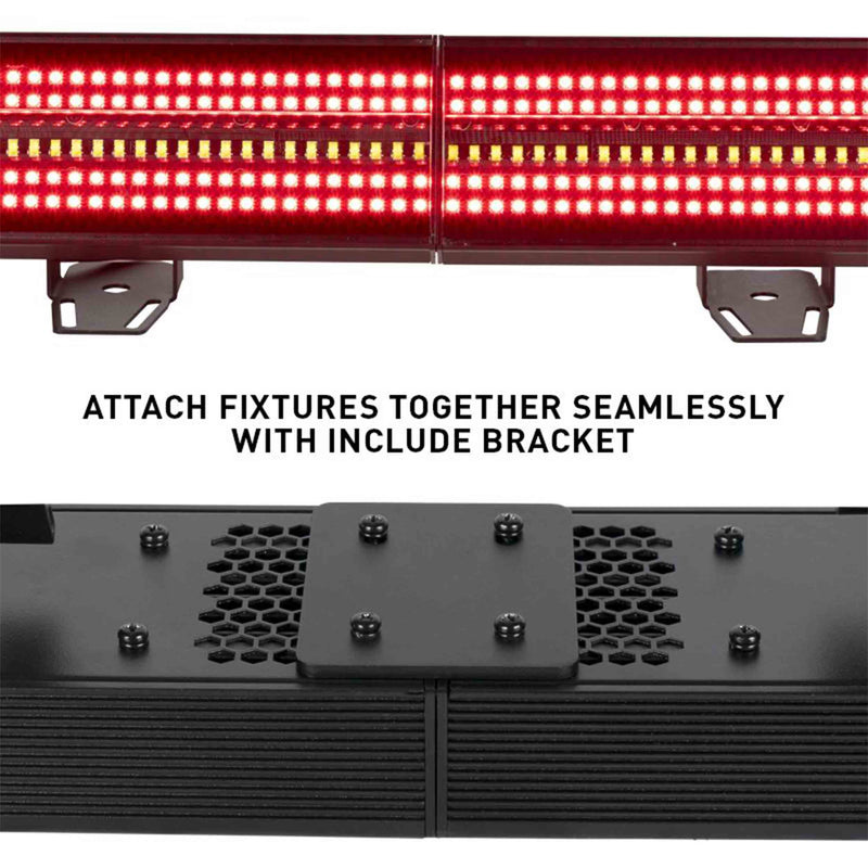 The ADJ Jolt Bar FX features a central strip of 112 x 5-Watt cool white SMD LEDs, surrounded on both sides by a total of 448 x 0.3W RGB color mixing SMD LEDs. This allows the same fixture to generate intense white strobing and multi-colored chase effects. Both types of LED are also grouped into independently controllable zones (16 white and 32 color), which means the unit can also be used to generate strobe chases and other ‘eye candy’ effects.