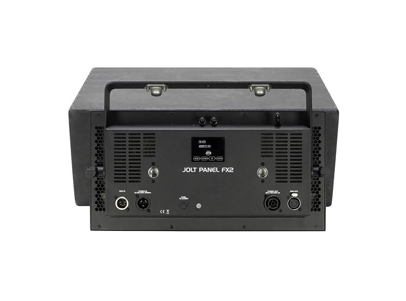 The Jolt Panel FX2 offers users an easy way to navigate the built-in features from an LCD display with a 4-button menu system. The display allows users to change dimming modes, dimming speed, programs, color macros, LED refresh rate and gamma settings, as well as setting the DMX address and channel modes. The rear panel has conveniently located 5-pin DMX in/out connections, locking power in/out sockets to daisy chain power, plus an OLED display with 4-button menu. There are also holes to connect an omega bracket to the Jolt Panel FX2 as an alternative to its variable angle bracket.