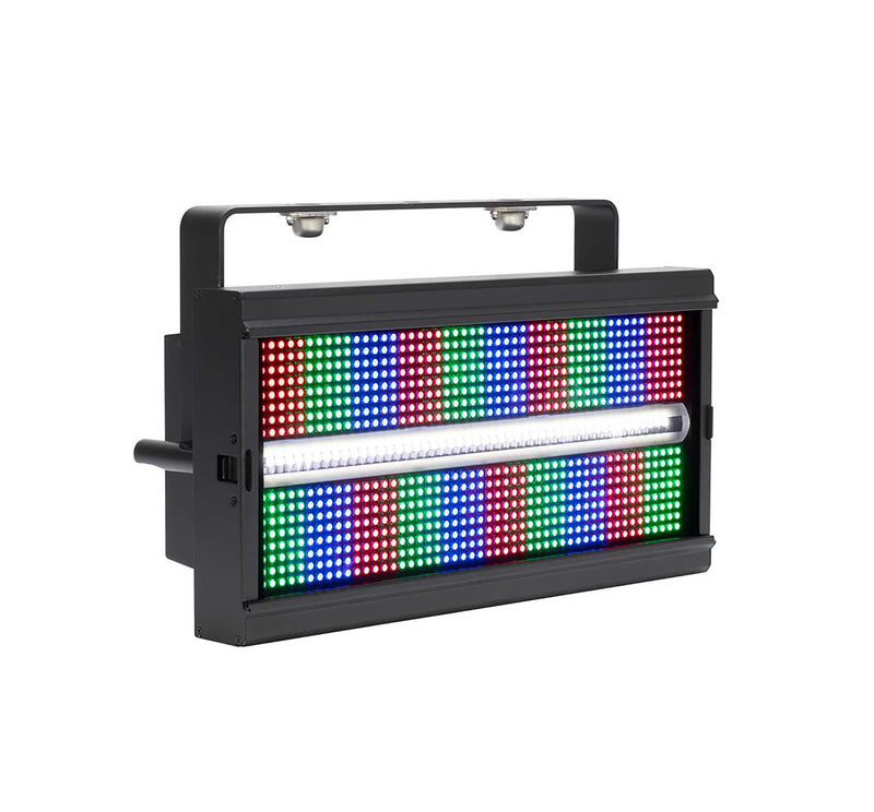 The ADJ Lighting Jolt Panel FX2 is an innovative multi-use strobe / wash / eye candy fixture. It is equipped with 800 x .5-Watt RGB SMD LEDs for color strobe, wash and eye candy effects, as well as 48 x 5-Watt white SMD LEDs located in the center of the fixture to create the traditional look of a strobe. Both types of LED are grouped into independent controllable zones (6 white and 40 color), allowing for the creation of eye-catching animated chase patterns. The Jolt Panel FX2’s massive light output is specifically designed for large stages, nightclubs, live events and touring.