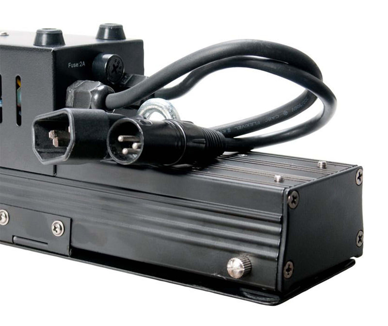 Ultra-HEX Bar 12 professional features include: 5 DMX modes (6, 7, 8, 12, & 36 channel), 6 operational modes, 5 dimming curves, flicker free operation a 4-Button DMX menu with digital display, plus ADJ’s patent pending magnetic “Quick Align” end locking allows for a seamless output of light with no breaks of color. Daisy chain up to 7 units together via the fixtures built-in IEC in/Out power connectors.