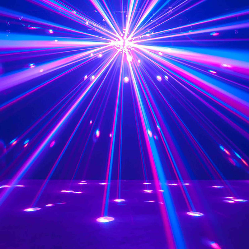 The ADJ STARBURST, RGBWA+UV LED Mirror ball effect is possibly the most futuristic of the new Startec Series effects, the Starburst is a rotating “futuristic Mirror ball” fixture that sends out incredibly concise beams of colored lighting that create a moving array of super-effective ‘stars’ when projected onto walls, ceilings and floors. This ‘night-sky’ effect is enhanced by the unit’s powerful 50W source, which consists of five 15W six-color (RGBAW+ PURPLE) LEDs and generates highly powerful beams of light in a wide pallet of colors. Furthermore, the Starburst’s tight beam angle helps the shafts of light cut through darkness and fog to offer a futuristic, far-reaching effect that will transform any small-medium sized venue.