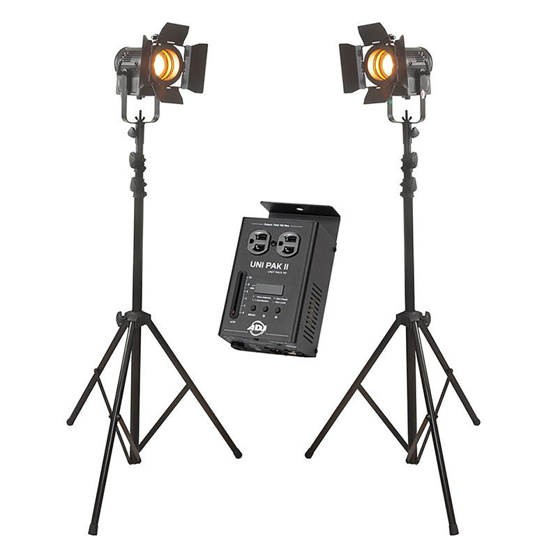 The ADJ Starter Stream PAK Lighting Set is ideal for one or two-person live streaming applications, such as vloggers, influencers, presenters, or performers, this comprehensive lighting kit includes everything you need to achieve professional-quality lighting. It features two LED studio lights for fill lighting, each with adjustable brightness and dimming control. The included barn doors allow for precise light direction, and the two sturdy lighting stands ensure stable positioning. Additionally, the kit supports both dimming and DMX control, offering versatile lighting options.
