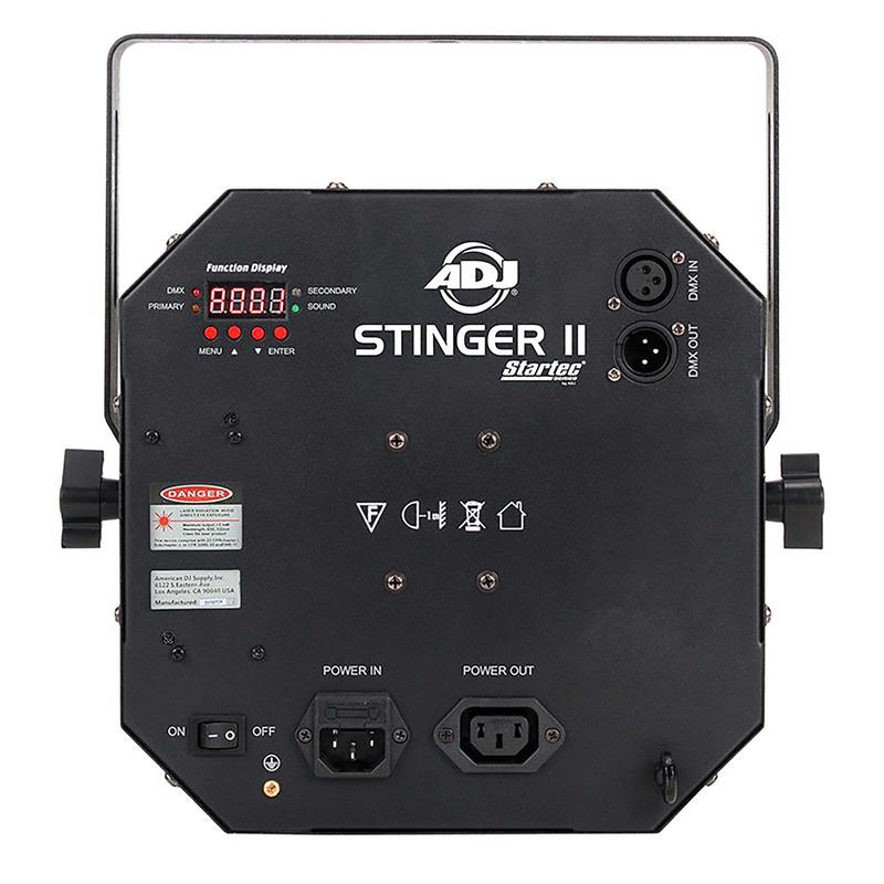 The ADJ Stinger II, 3-FX-IN-1 Moonflower, strobe, and laser is a mobile friendly fixture. What’s different with the Stinger II is the eight 3W UV LEDs that offer a new dimension of excitement for mobile DJs, bands, small clubs and bars, roller rinks and bowling centers with its room-filling razor sharp beams of light.