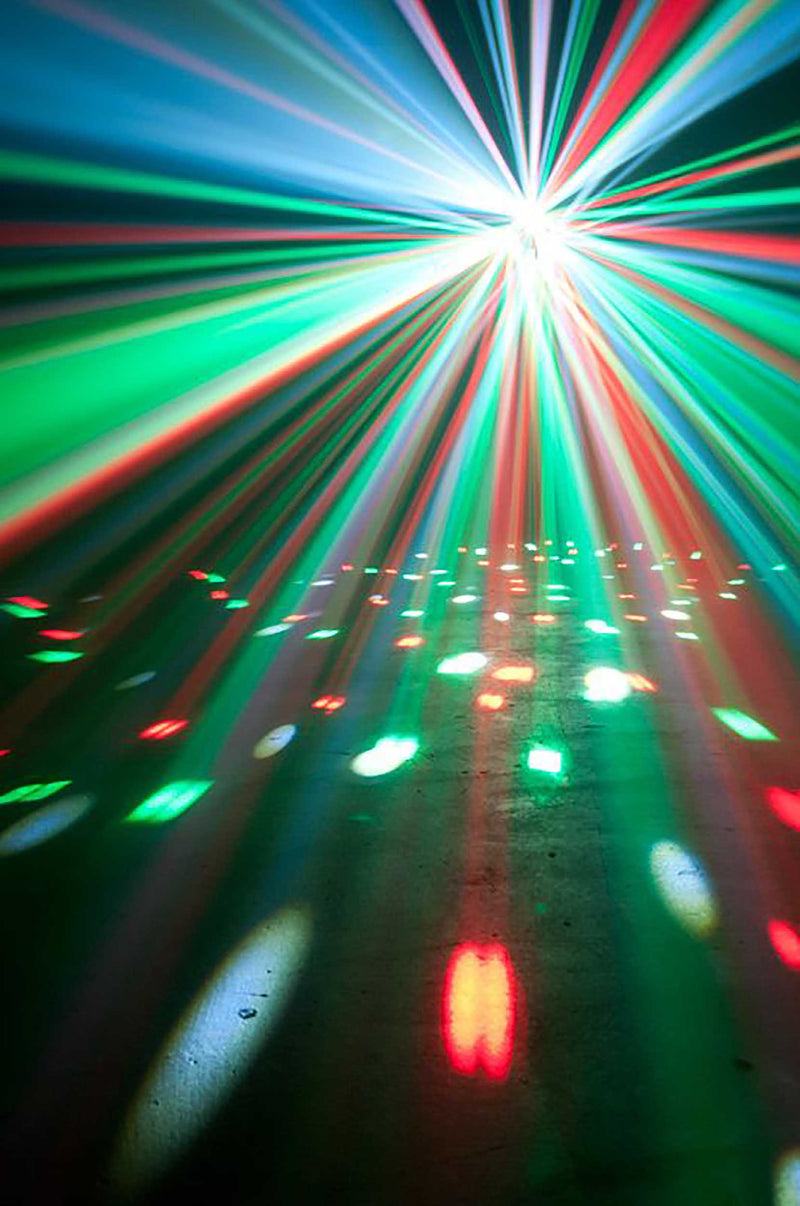 The UV LEDs combined with the HEX LED Moonflower and the red and green “Galaxian” style laser give entertains a lot of options for hours of entertainment. This fixture has 15 built-in color options, smooth stepper motors for a premium lightshow and a 4-button DMX function display.