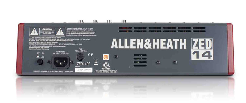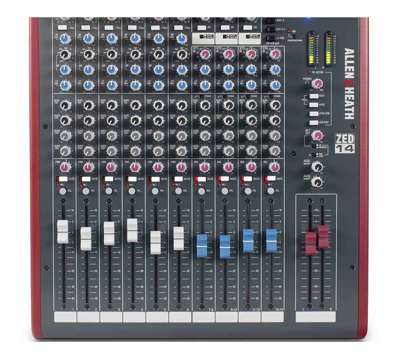 The Allen & Heath ZED-14 is a Multipurpose 14-Channel Mixer with USB Audio Interface is a perfect mixer for small bands, solo performers or AV applications. Its comprehensive feature set, compact size and fine lines combine to make it one of the best small mixers around. Provided with configurable USB audio in/out makes it easy to capture stereo recordings, 6 mic or line inputs, 4 stereo inputs with EQ, there are an incredible 157 controls on the front panel of the ZED-14. This is a mixer for anyone, from entry-level to professionals, who appreciates fantastic sound, rugged build quality, and imaginative feature sets. It’ll be equally happy running your gig on stage, recording life or mixing down in your studio at home.