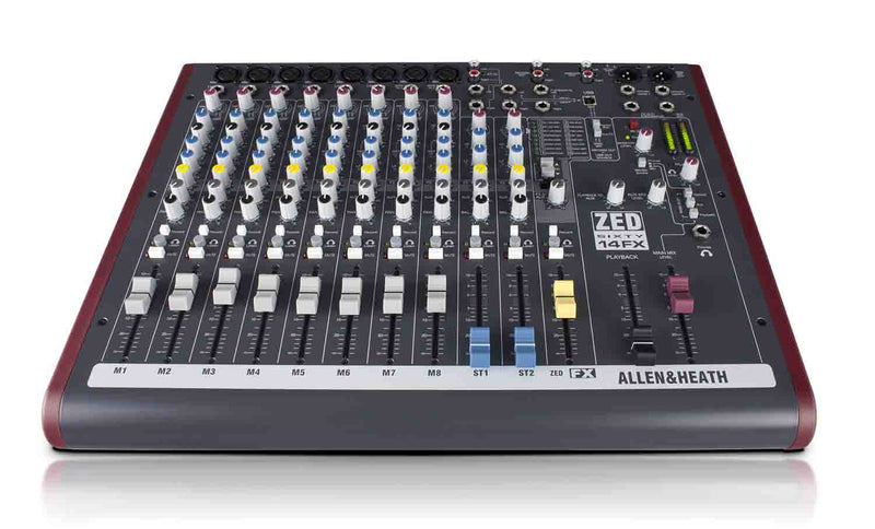 The Allen & Heath ZED60-14FX is a Multipurpose 14-Channel Portable Mixer with FX and USB Port is ideal for small bands. This mixer is a guitarist’s dream. Two of the 8 mono channels have high impedance jack inputs that can take a normal line level or a low-level input from a guitar pickup, so guitars can be plugged straight into the mixer without the need for DI boxes. These inputs have been crafted to recreate the sound of a classic tube preamp in a combo or head amp for incredible definition and warmth. Two stereo inputs are provided for MP3/CD players or keyboards. ZED60-14FX comes with configurable USB audio in/out, making it easy to capture a stereo recording at the gig or in the studio. The mixer is equipped with professional XLR main stereo outputs, a flexible monitoring section with headphone and speaker feed outputs, and 16 stunning FX.