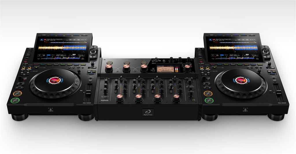 This DJ package includes the AlphaTheta CDJ-3000X Media Player and the AlphaTheta 4-Channel Pro Rotary Mixer - Euphonia. The CDJ-3000X offers wireless connectivity, a 10.1" touchscreen, and ESS DAC sound quality, while the Euphonia delivers 4 channels with smooth rotary faders, warm studio-quality sound, and refined control for expressive mixing, making this bundle perfect for professional DJs.