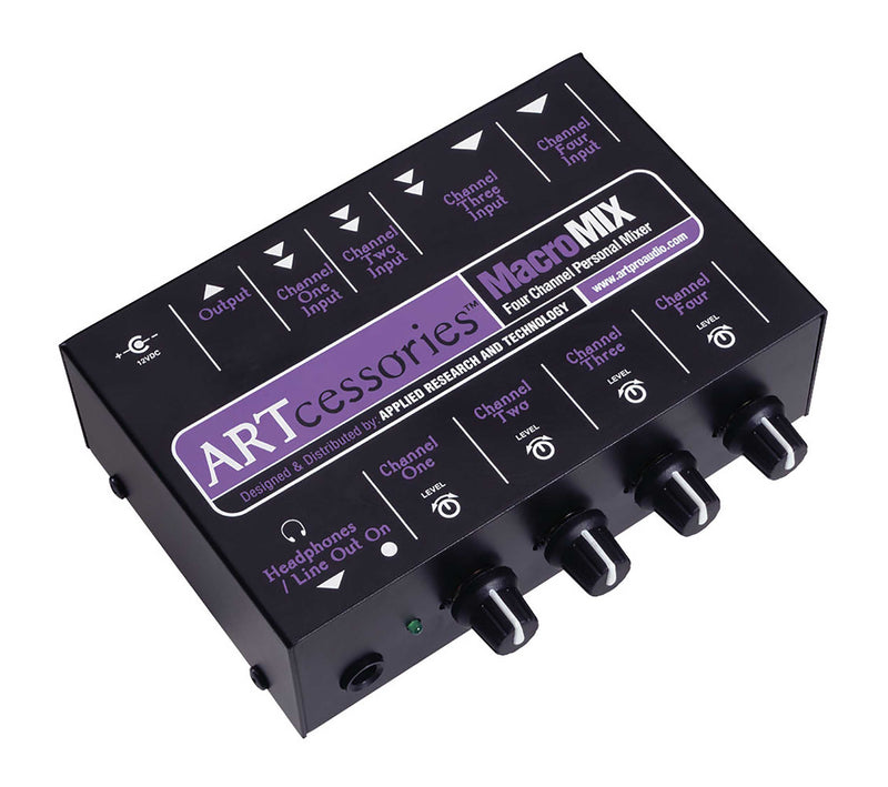 The Art MacroMIX is a Four-Channel Personal Mixer. Each mic channel on the ProMIX has both phantom power and low-frequency cut selectable via DIP switches plus a level control. The balanced XLR line output can be connected to a mic input on the mixer and headphones or a powered monitor can be connected to the Phone/Aux output. And if AC power is not available, the ProMIX runs on batteries as well.