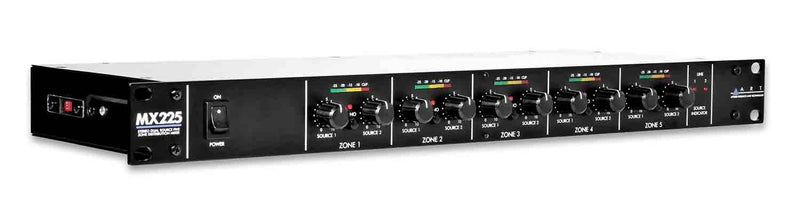 The Art MX225 is designed for remote volume control of multiple amplifiers or powered speakers in a distributed audio system. Two stereo sources are available to each of five output zones. Each source input pair handles separate left and right balanced line level signals. Each output zone features independent level control from inputs 1 and 2, stereo/mono selector with mono indicator, LED level metering, and left and right balanced line level zone outputs. All audio connections are balanced XLR. The built in power supply and single high 19″ rack mount format allows for easy installation and reliable operation.