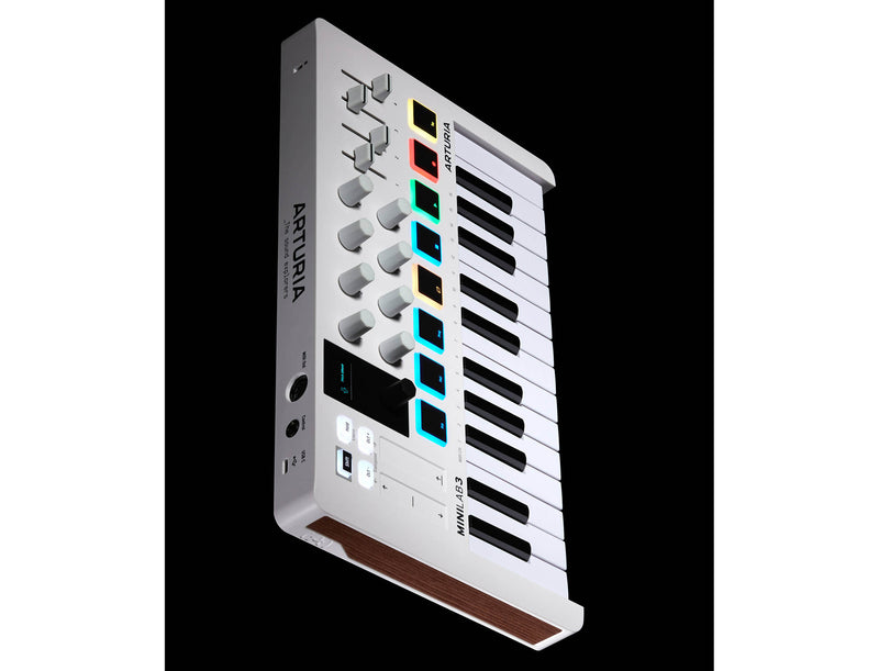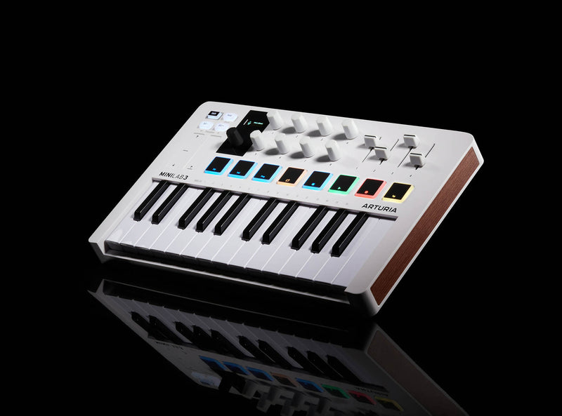The Arturia MiniLab 3 is an Analog Lab Lite UVI Grand and Ableton Lite. Find your flow and enjoy making music with a plug-and-play MIDI keyboard that does it all. MiniLab 3 gives you easy controls, great-feeling keys, and a fully-integrated all-in-one software package that’s ready to get creative right out of the box. Producers and musicians in search of a compact MIDI keyboard and pad controller that makes music right out of the box will be impressed with the Arturia MiniLab 3, a portable USB-MIDI controller that ships with a comprehensive audio-production software suite.