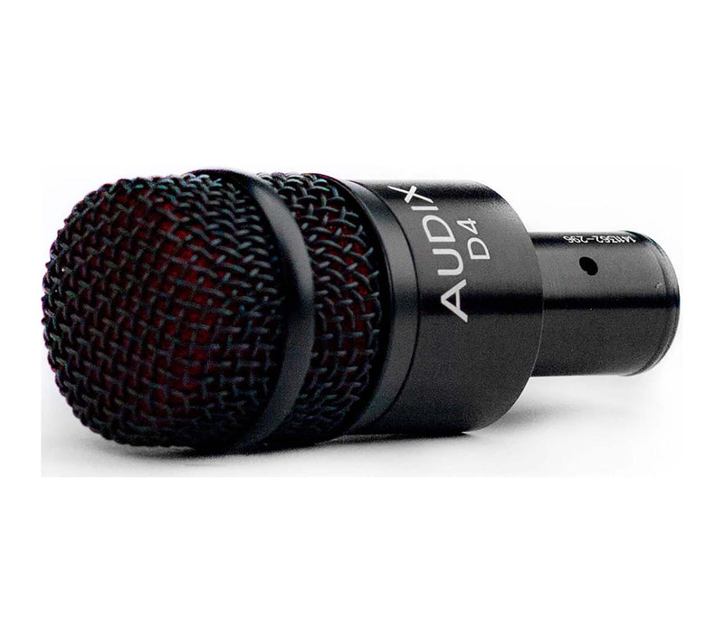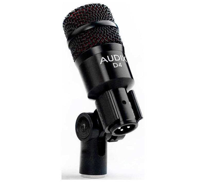 The Audix D4 is a Hypercardioid Dynamic Instrument Microphone With a wide frequency response of 40 Hz – 18 kHz and the ability to handle SPLs in excess of 144 dB, the D4 dynamic instrument microphone is an excellent choice for miking instruments requiring precise, low-frequency reproduction such as large rack toms, floor toms, cajon, djembe, tympani, leslie bottom, bass flute, saxophone and baritone saxophone, trombone, acoustic bass, bass cabinets, and small kick drums.