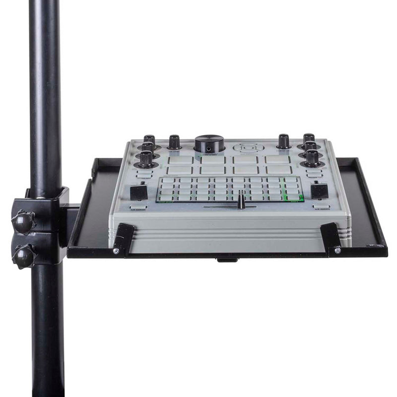 The Headliner HL31000, Accessory Tray For Mic Stands, Speakers Stands and Lighting Bars Mount is a practical heavy-duty shelf that mounts to speaker stands, lighting stands, or truss. Designed for performers and creators, it’s a convenient way to keep your smaller gear within reach, such as personal monitoring mixer, wireless mic receiver, sampler, or 13” laptop. Use horizontally to store your personal items, or tilt it forward for a more natural angle when using with a mixer or pad controller. A dual clamp mounts to any tube up to 2” in diameter.