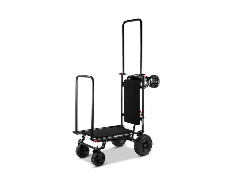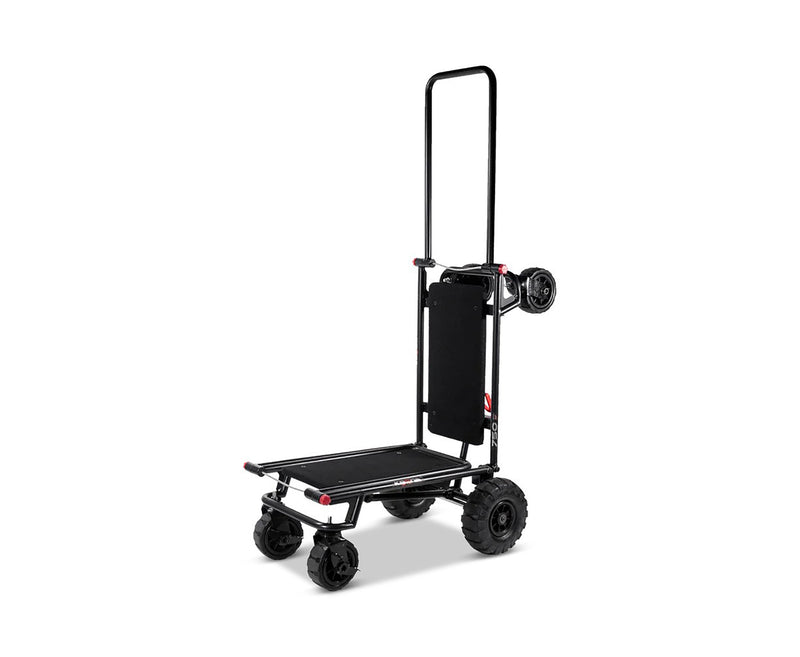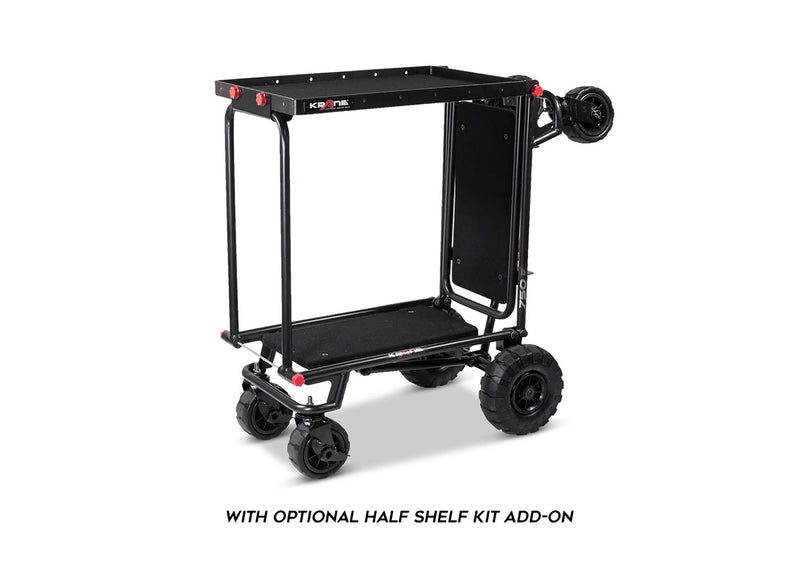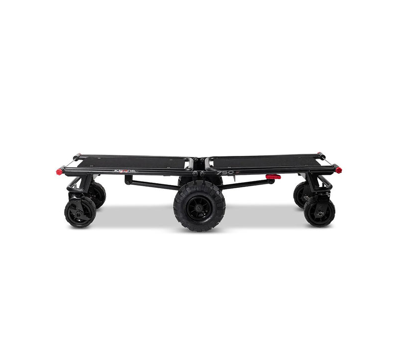 The Krane AMG750-AT Heavy Equipment Hauler is an ALL-TERRAIN Multi-Mode Folding Longbed Cart with 750 lb Capacity. Designed for Pro Audio and DJ Professionals with heavy loads... It's a compact but heavy-duty smart hauler. The AMG 750 quickly transforms from its folded mode into a 4-wheeler cart that can be pushed or pulled, a super-maneuverable tower cart, and into a longbed "u-boat" cart that boasts a ZERO RADIUS turn capability, thanks to its large never-flat center wheels supporting the load. Comes complete with built-in anti-slip carpeted decks so your stuff securely stays on board - Up to 750 lbs of it.