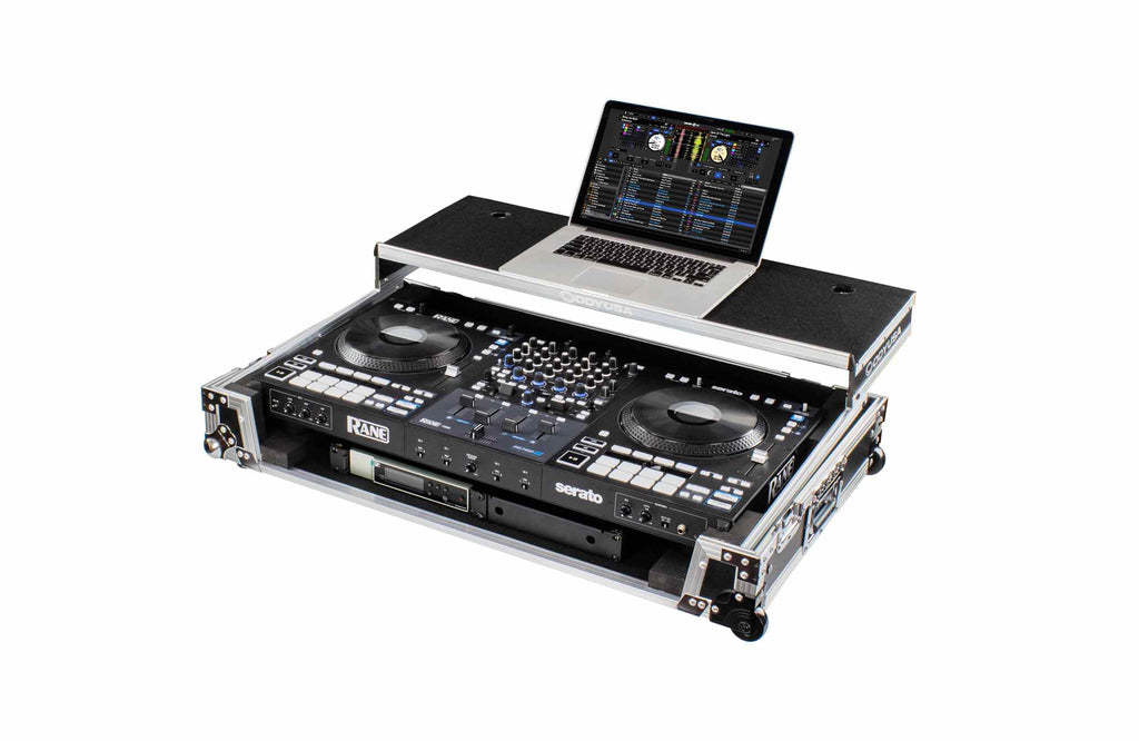 The Odyssey FZGSRANE4W1 1U Flight Case with Glide Style Laptop Platform and Wheels for Rane Four Controller is designed to protect and transport the Pioneer DJM-A9 mixer. It features a bottom 1U rack space, a cable port hole, corner wheels, a glide platform port hole, a laptop platform (glide style), lid foam, and rubber feet. The bottom 1U rack space is perfect for storing cables, adapters, or other small accessories. The cable port hole allows you to easily run cables through the case without having to open it. The corner wheels make it easy to transport the case, even when it is fully loaded.